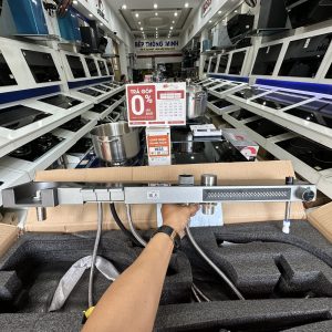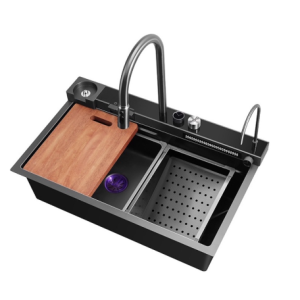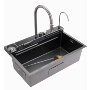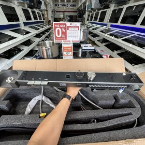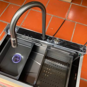 Dải vòi kéo dài trên thanh chậu : Gồm một xịt rửa cốc tự động bằng áp lực nước, 1 vòi nước RO, 1 vòi nóng lạnh rút dây, 1 vòi chế độ xả thác, màn hình led hiển thị nhiệt độ. Phụ kiện bao gồm : Một bộ xiphong thoát đáy, 1 khay chéo, 1 chậu phụ , 1 thớt gỗ
