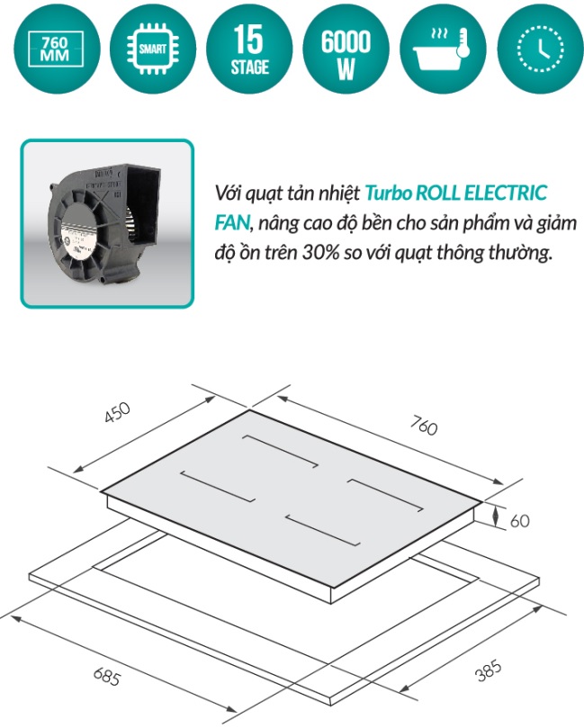 - Quạt tản nhiệt Turbo độ ồn ≤38dB, giữ môi trường bếp yên tĩnh.