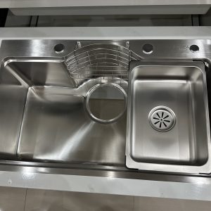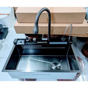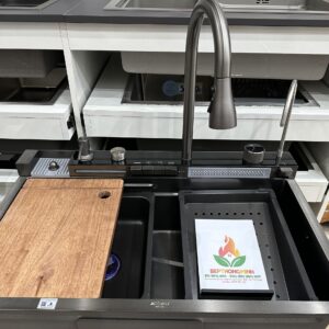 Dải vòi kéo dài trên thanh chậu : Gồm một xịt rửa cốc tự động bằng áp lực nước, 1 vòi nước RO, 1 vòi nóng lạnh rút dây, 1 vòi chế độ xả thác nước dạng suối và 1 vòi thác dạng tia, màn hình led hiển thị nhiệt độ. Phụ kiện bao gồm : Một bộ xiphong thoát đáy, 1 khay chéo, 1 chậu phụ , 1 thớt.