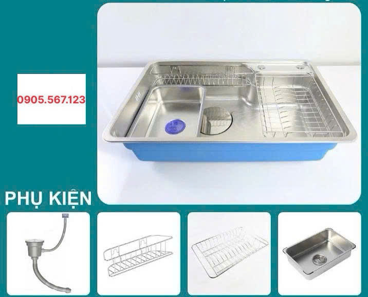 - Thiết kế hiện đại với gờ hạ bậc – tích hợp phụ kiện thông minh: Thớt, rổ phụ, rổ lưới, siphon.